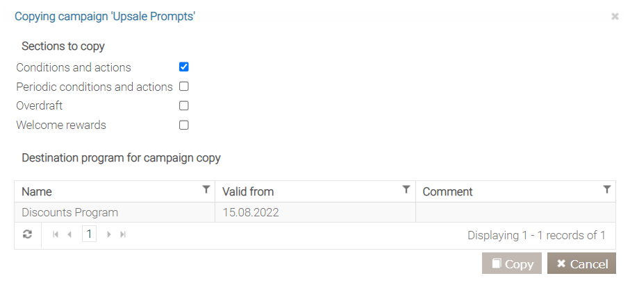 - Wybierz ustawienia, które chcesz uwzględnić w kopiowanej kampanii: Warunki i działania, Warunki i działania okresowe, Debet oraz Nagrody powitalne.