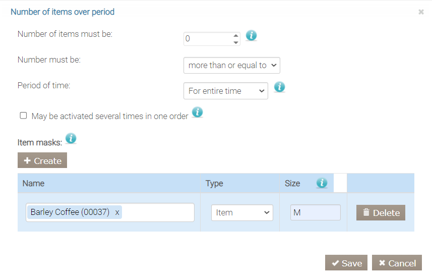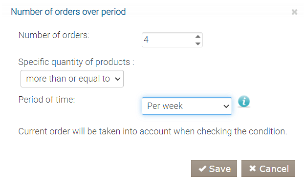 Ten warunek jest używany w kampaniach, gdzie gość otrzymuje rabat lub prezent, jeśli zamówi kilka pozycji w określonym czasie, niekoniecznie w jednym zamówieniu, np. „Zamów 7 kebabów, otrzymaj prezent”, „Rabat na każdy szósty lunch w Happy Hour” itp.