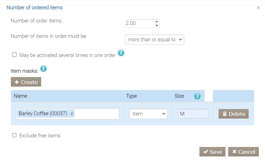 - Określ, ile pozycji z menu musi zostać zamówionych, aby wyzwolić akcje: więcej niż, mniej niż, równa się lub wielokrotność określonej liczby.