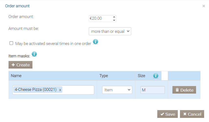 Możesz sprawdzać nie tylko łączną kwotę zamówienia, ale także sumę pozycji. Na przykład w kampanii „Kup pizzę za 50 € i otrzymaj darmową puszkę coli”. W takim przypadku dodaj maskę pozycji: kliknij Utwórz i określ, jak pozycje mają być wybierane — według kategorii, listy pozycji lub wpisz maskę pozycji.