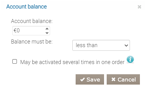 Załóżmy, że chcesz, aby Twoi goście mieli co najmniej 500 punktów bonusowych na swoich kontach, aby móc ich użyć do płatności. W takim przypadku dodaj do programu warunek Saldo konta, określ wymaganą wartość i wybierz parametr porównania: mniej, więcej itp.