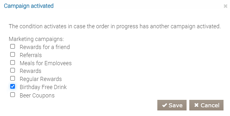 Na przykład: lokal ma ustawione dwie kampanie — jedna oferuje rabat na całe zamówienie, druga daje darmowe danie. Jeśli nie są skonfigurowane dodatkowe ustawienia, a zamówienie spełnia warunki obu kampanii, obie zostaną zastosowane. Aby zapewnić aktywację tylko jednej z nich, należy dodać warunek Aktywacja kampanii do kampanii, która nie powinna być oferowana klientowi.