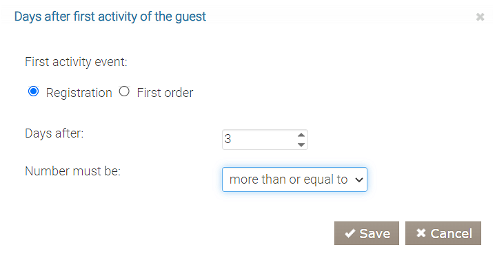 Tutaj możesz wybrać typ pierwszej aktywności gości, za którą gość otrzyma nagrodę: rejestrację w programie lub pierwsze zamówienie. Wybierz liczbę dni po pierwszej aktywności oraz warunek.