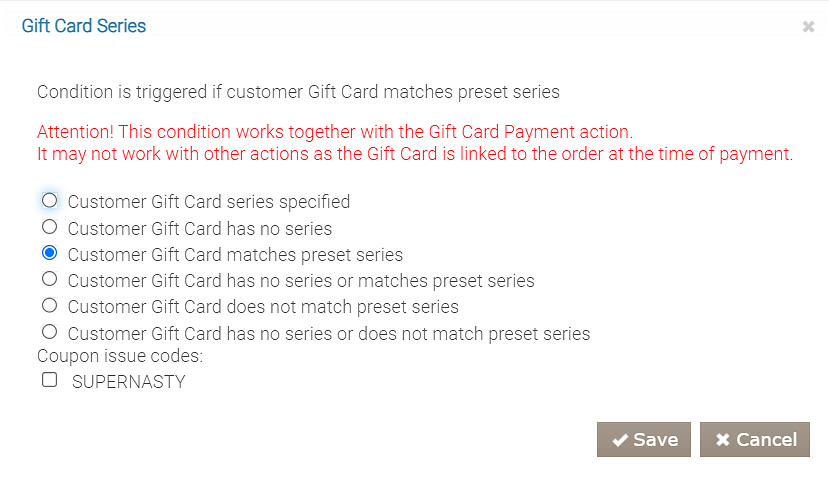 Ten warunek jest używany w programach kart podarunkowych, gdy trzeba ograniczyć użycie kart podarunkowych. Może być łączony tylko z akcją Płatność kartą podarunkową.