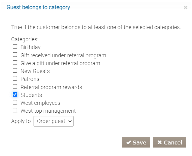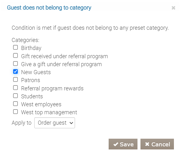 Ten warunek również dobrze sprawdza się w programach cateringowych dla firm lub programach poleceń. W zależności od ustawień programu warunek sprawdza kategorię gościa lub polecającego.