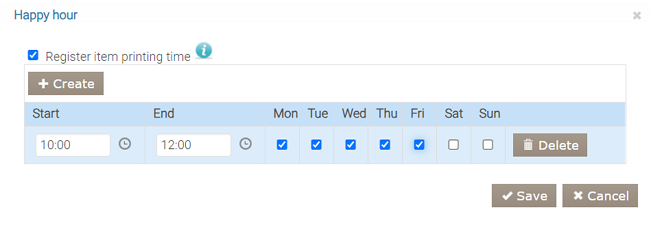 Załóżmy, że zamówienie zawiera pięć pozycji z menu. Jeśli pierwsze dwie pozycje, na przykład, zostały wydrukowane podczas Happy Hour, a pozostałe trzy poza tym okresem, rabat zostanie zastosowany tylko do pierwszych dwóch. Aby rabat został zastosowany do całej kwoty zamówienia, wszystkie pozycje muszą zostać wydrukowane podczas Happy Hour.