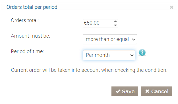 Gość może otrzymać rabat, który zależy od łącznej wartości zamówień złożonych wcześniej. Określ tę kwotę oraz wymagany okres w ustawieniach warunku „Liczba zamówień w okresie”.