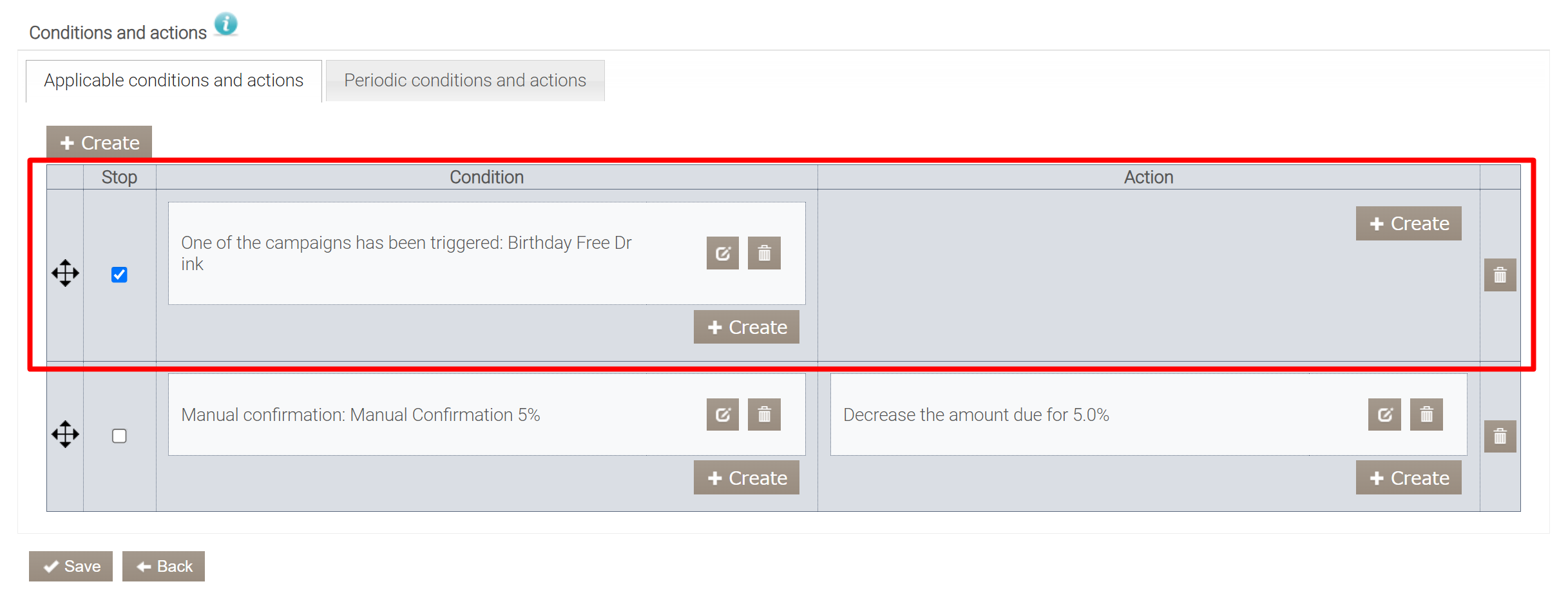 Dodaj warunek Aktywacja kampanii do kampanii Rabat na zamówienie i włącz opcję Stop dla tego bloku warunków.