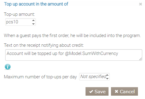- W tym samym polu akcji utwórz akcję Doładuj konto o kwotę. W nowym oknie określ kwotę doładowania. Jeśli Twoi goście zamówią 1 pizzę, ich konto zostanie doładowane o 1 pozycję. Wpisz tekst do wydrukowania na paragonie w odpowiednim polu. Określ maksymalną liczbę doładowań na dzień, jeśli dotyczy.