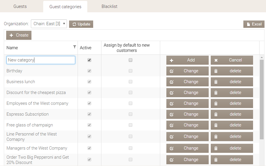 Kategoria gościa oznacza określoną grupę gości, dla której można skonfigurować program cateringowy na specjalnych warunkach. Kategorie mogą być używane na przykład do rozróżnienia menedżerów firmy i pracowników liniowych.
