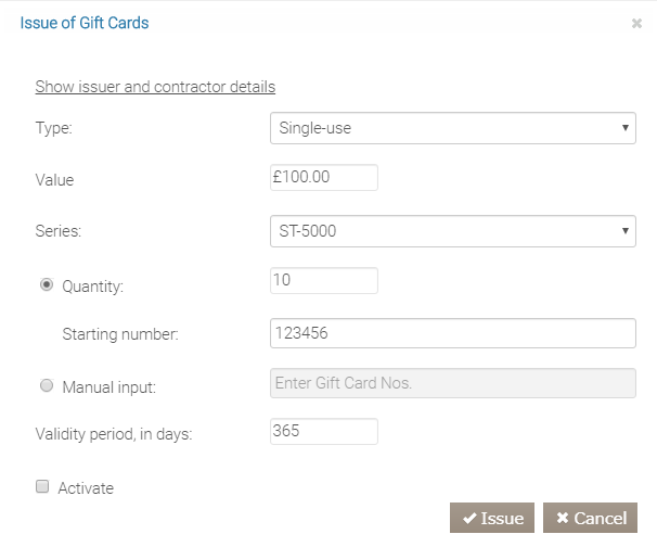Jeśli masz zamówienie na określoną liczbę kart podarunkowych, powinny one zostać aktywowane w momencie wydania. W tym celu zaznacz Aktywuj.