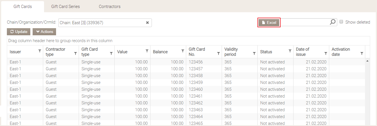 Aby przekazać wygenerowane numery do drukarni, wyeksportuj je do Excela: wybierz wymagane karty podarunkowe, na przykład wszystkie nieaktywne karty ST-1000, i kliknij Excel.