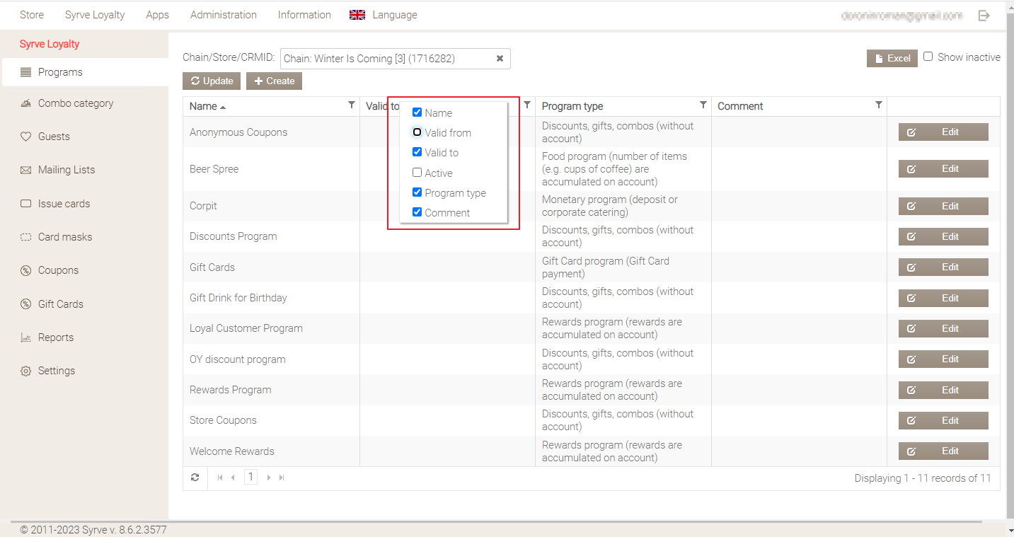 Możesz wybrać, które kolumny będą wyświetlane na stronie Kart Podarunkowych w aplikacji Syrve Loyalty oraz eksportowane do pliku XLS do dalszej analizy.