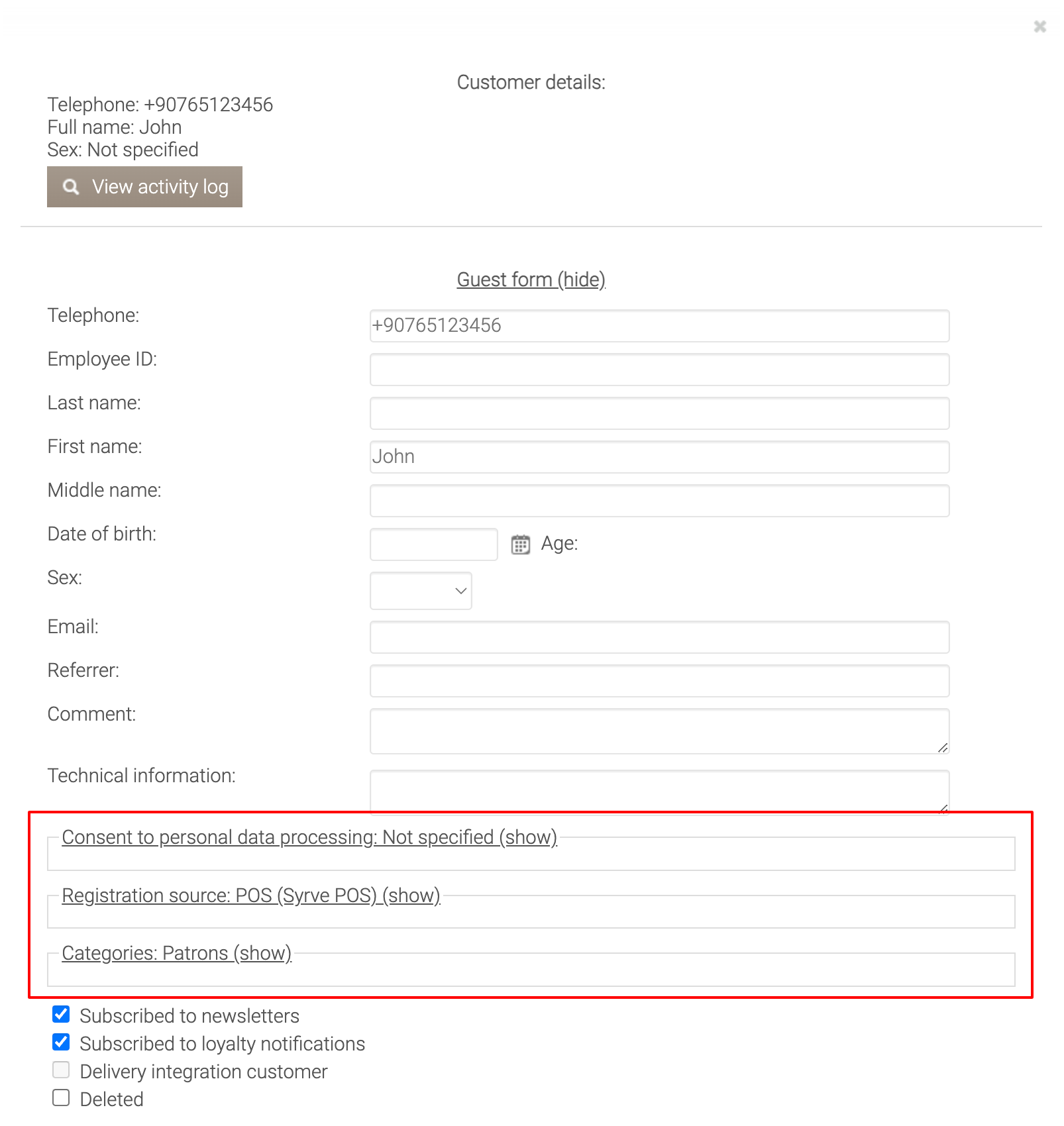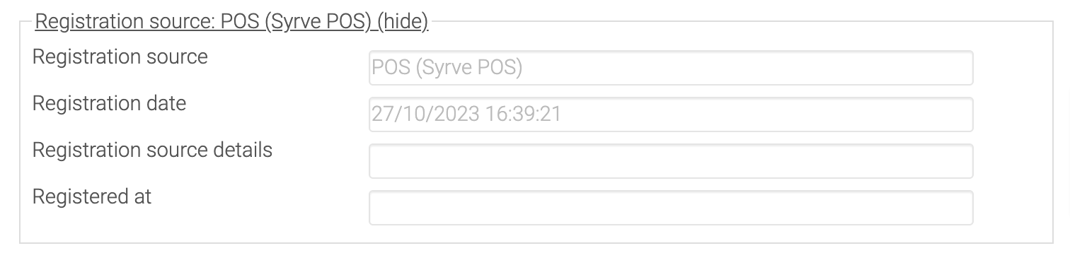 - Szczegóły źródła rejestracji — dodatkowe informacje, dostępne tylko dla użytkowników z uprawnieniami administratora. Zobaczysz tutaj identyfikator POS, jeśli gość został zarejestrowany na POS, oraz identyfikator sklepu, jeśli gość został dodany w aplikacji Syrve Office.