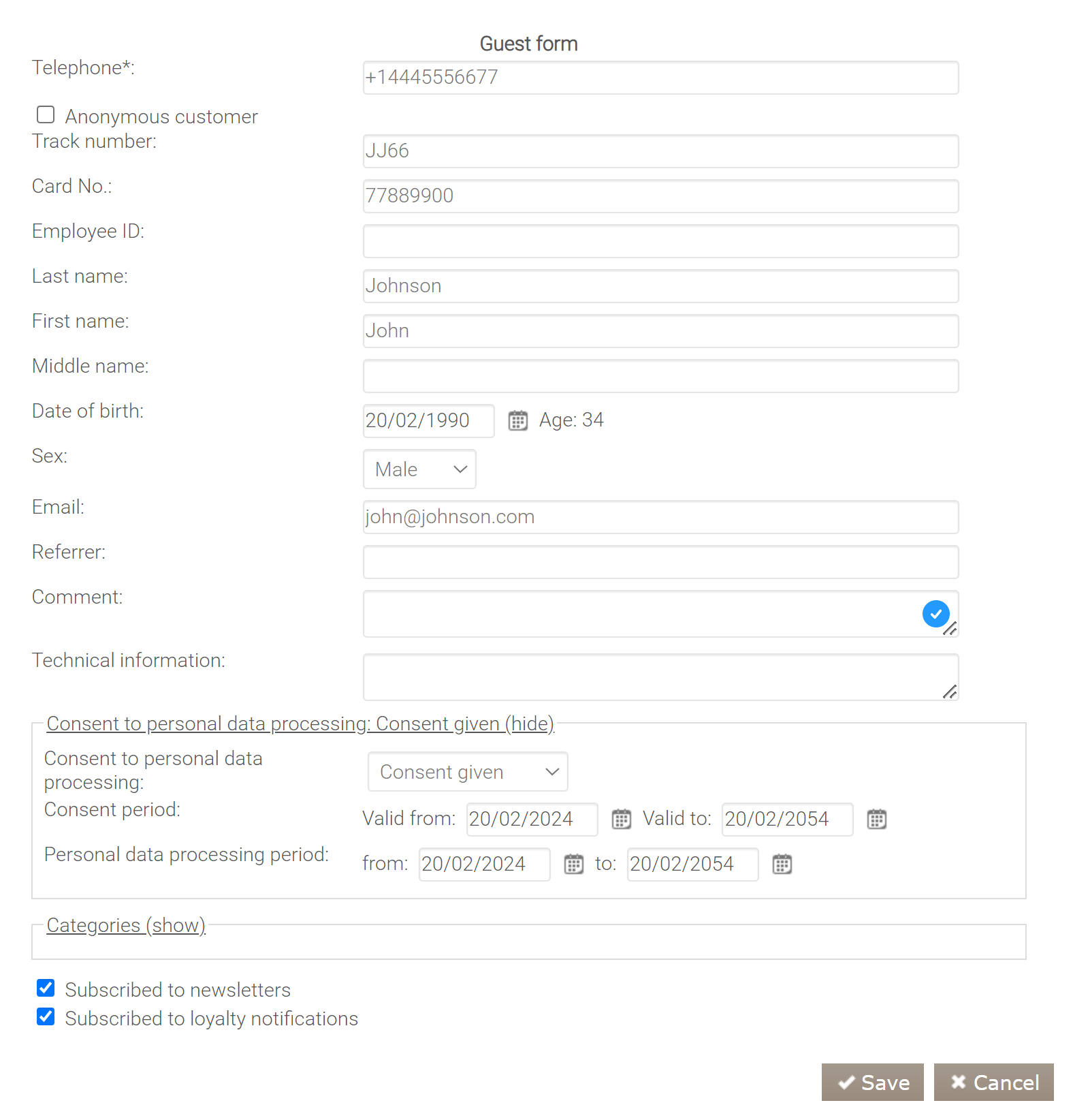 - Zarejestrowany w — pokazuje identyfikator sklepu, w którym gość został zarejestrowany. Pole dostępne tylko dla użytkowników z uprawnieniami administratora.