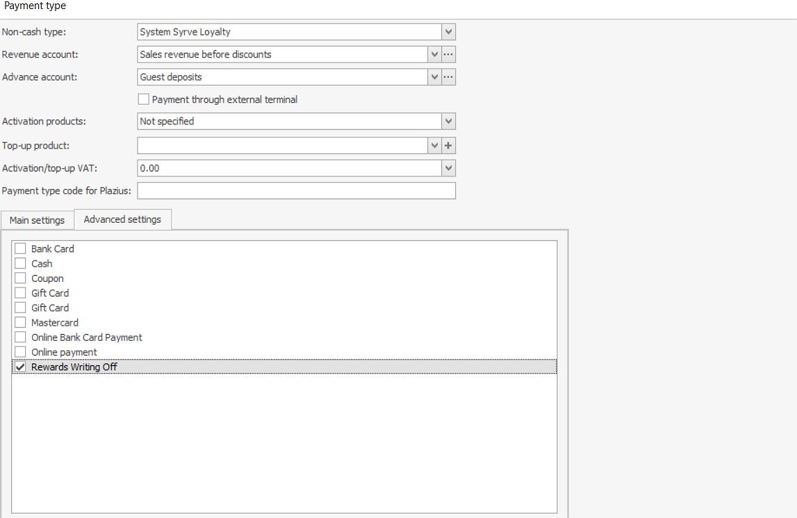 Kliknij Pobierz programy marketingowe z akcją płatności na karcie Zaawansowane ustawienia. W efekcie zostanie zaimportowana lista aktywnych kampanii, w ramach których dokonywane są płatności za pomocą środków lojalnościowych, z serwera Syrve Loyalty. Ustawienia takich kampanii zawierają akcję Płatność na konto.