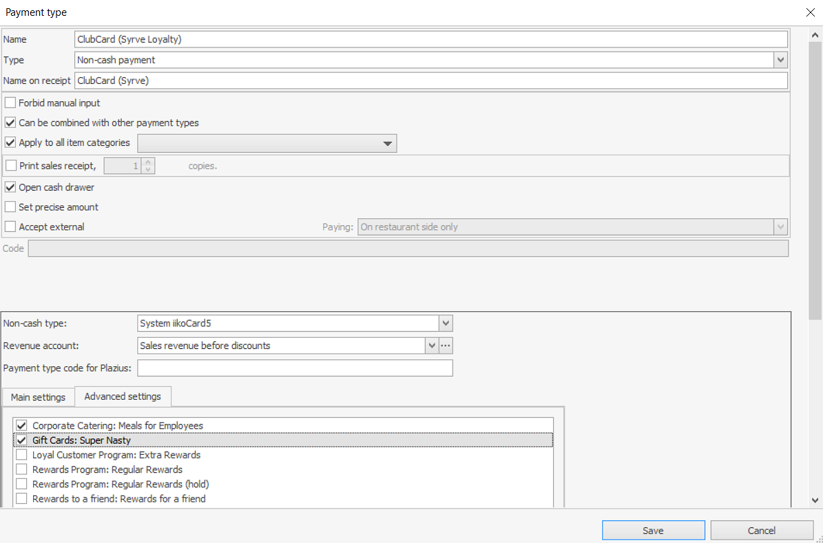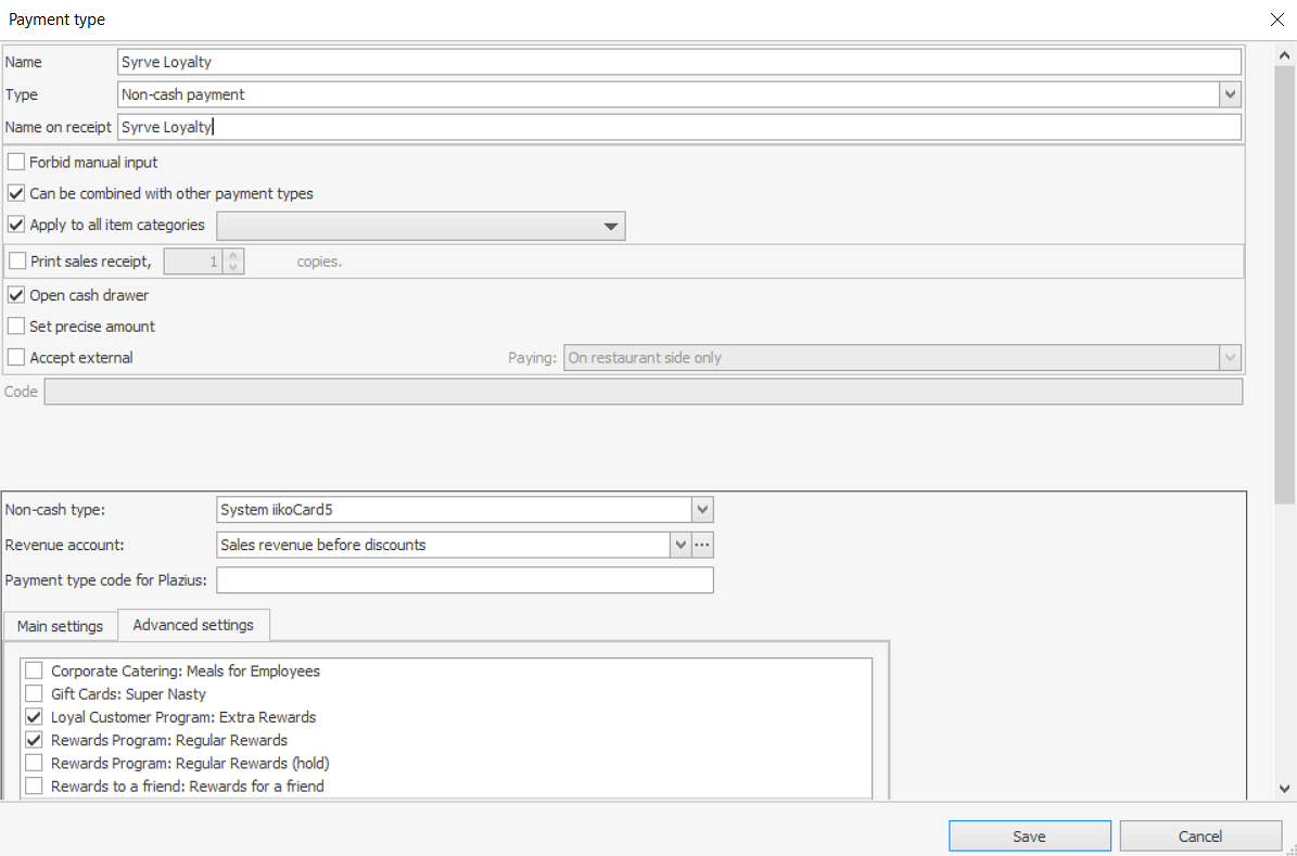 Aby zarejestrować środki otrzymane od klientów za pośrednictwem systemu Syrve Loyalty, utwórz nową metodę płatności. Jest ona używana do opłacania zamówień za pomocą środków lojalnościowych i punktów bonusowych gościa oraz pozwala zarejestrować kwotę zamówienia jako przychód.