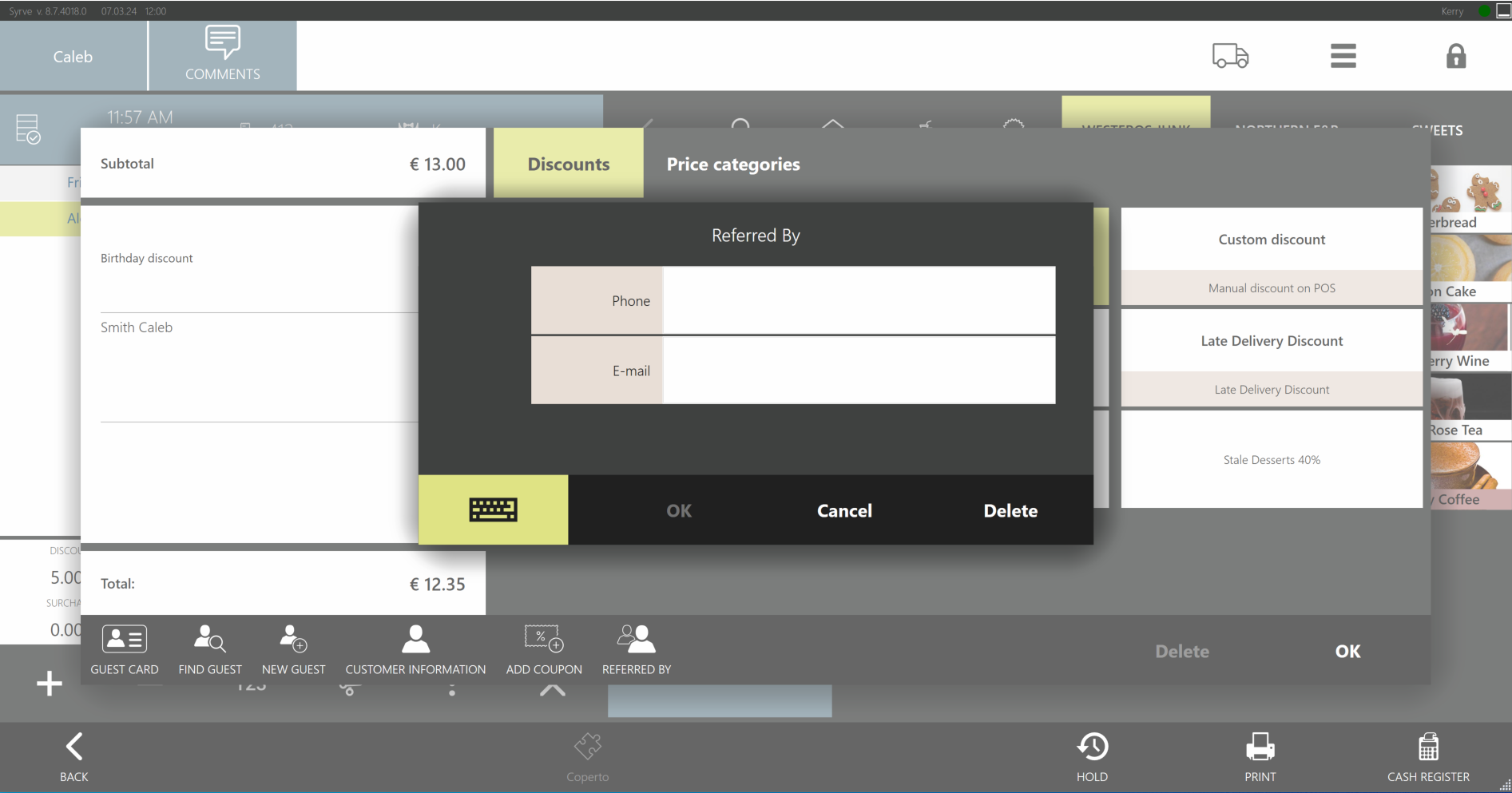Zapytaj gościa, kto udzielił polecenia. Stuknij Polecony przez. Przycisk jest aktywny tylko wtedy, gdy zamówienie jest powiązane z gościem. W przypadku nowego gościa wprowadź numer telefonu lub e-mail polecającego klienta używany w systemie. Stuknij OK.