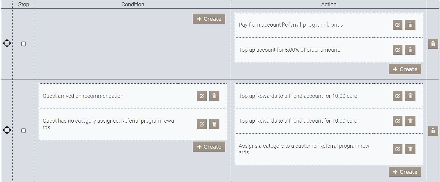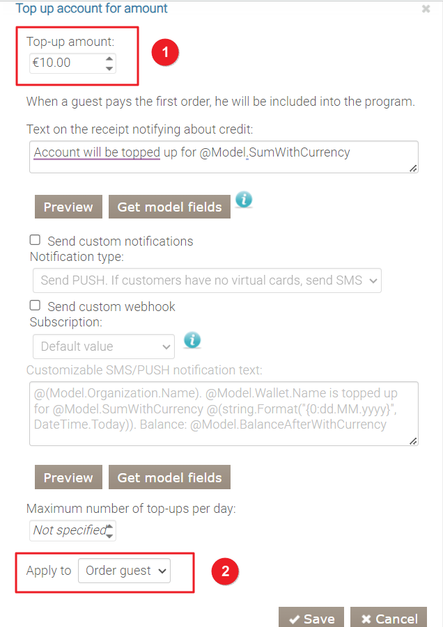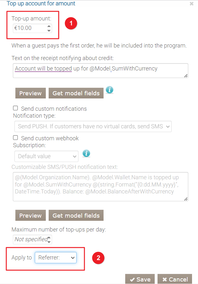 - Dwie podobne akcje — „Doładuj konto o kwotę”. W polu Kwota doładowania wpisz 10 punktów dla obu. W jednej akcji Dotyczy to „Gość zamówienia”, w drugiej — „polecający”.