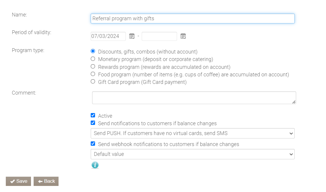 - Przejdź do Syrve Loyalty > Programy i utwórz nowy program.