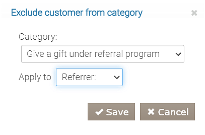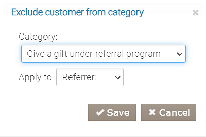 * Akcję „Wyklucz klienta z kategorii”. Określ Kategorię — „Daj prezent w ramach programu poleceń” i wybierz Dotyczy — Polecający.