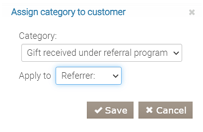 - Akcję „Przypisz kategorię klientowi”. Określ Kategorię — „Prezent otrzymany w ramach programu poleceń” i wybierz Dotyczy — Polecający.
