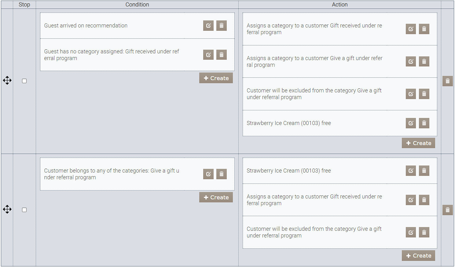 * Akcję „Wyklucz klienta z kategorii”. Określ Kategorię — „Daj prezent otrzymany w ramach programu poleceń” i wybierz Dotyczy — Polecający.