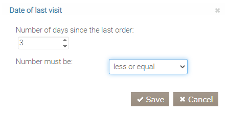Warunek Data ostatniej wizyty. Wpisz 3 w polu Liczba dni od ostatniego zamówienia i wybierz warunek Mniej lub równe.