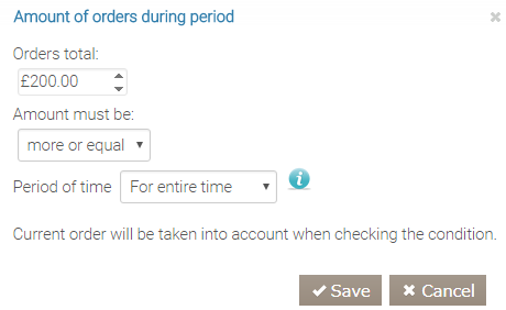 - W pierwszym warunku wpisz 200 € w polu Łączna wartość zamówień i wybierz „więcej lub równe” w polu Amount must be. Okres czasu - „Przez cały czas”.