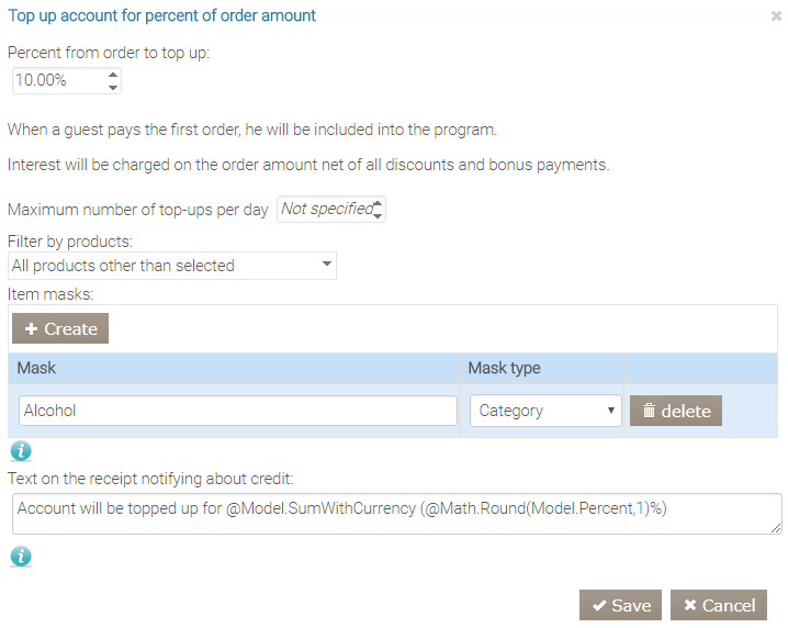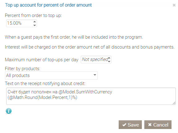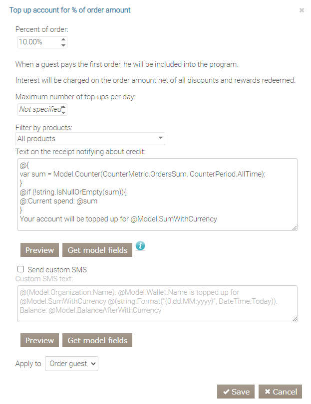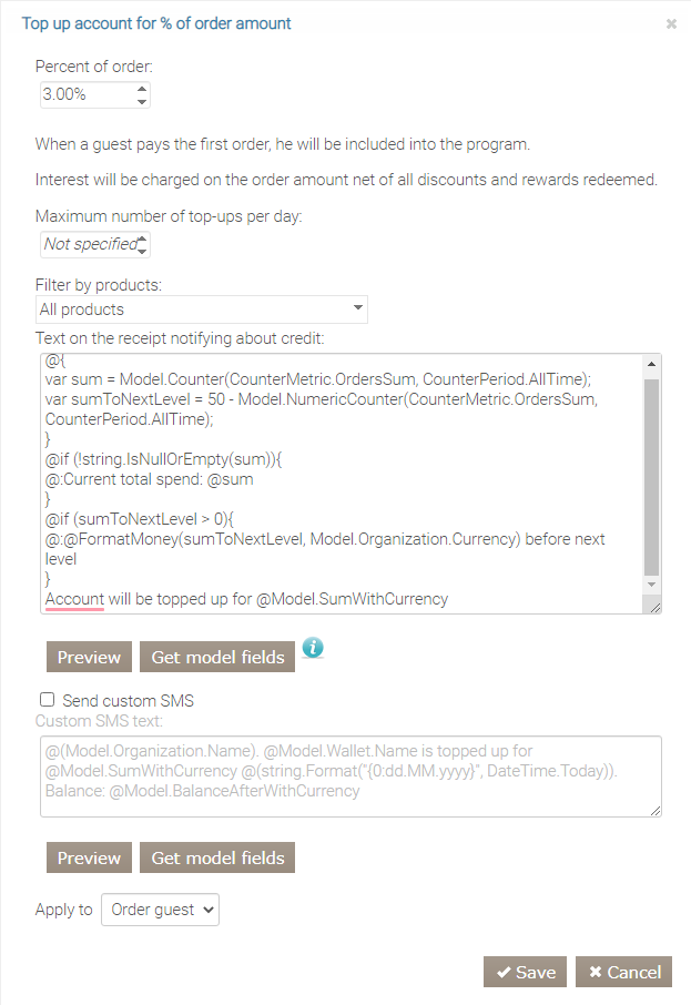 - „Top up account for % of order amount.” Określ stawkę doładowania - 3%. Dodaj tekst na paragon:
