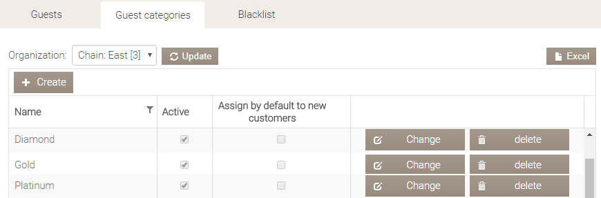 - Przejdź do Guests > Guest categories w Syrve Loyalty i utwórz kategorie używane w programie: Gold, Platinum, Diamond. Zaznacz opcję Assign by default dla nowych klientów w kategorii Gold.