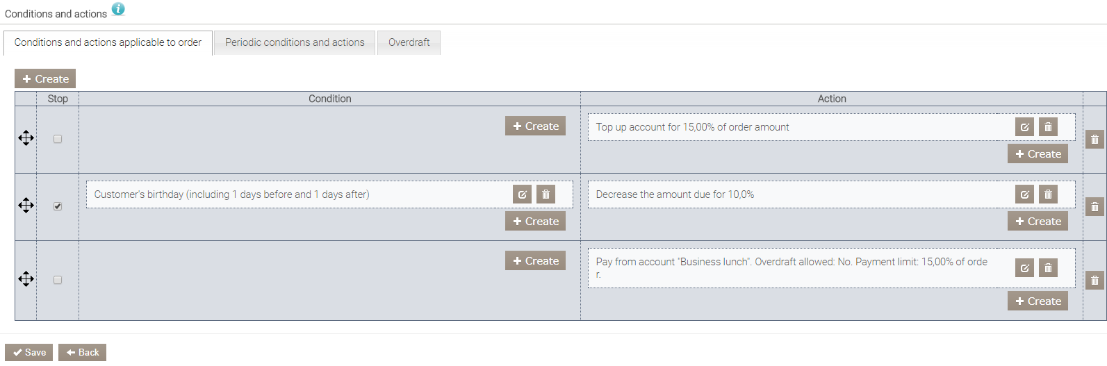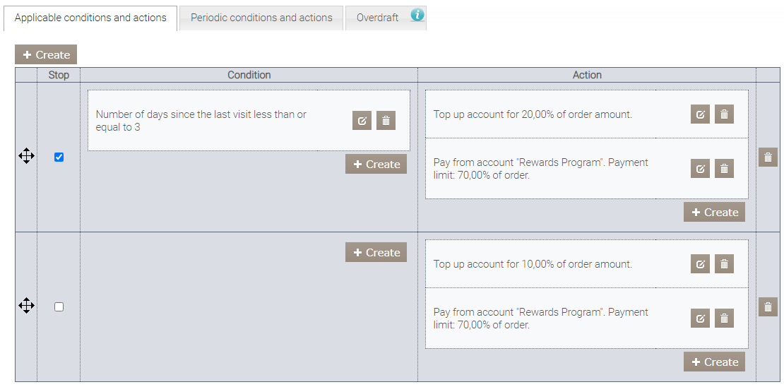 - Dodaj akcję Top Up Account with Percent of Order, aby skonfigurować zasady naliczania nagród. Ustawienia powinny wyglądać następująco: