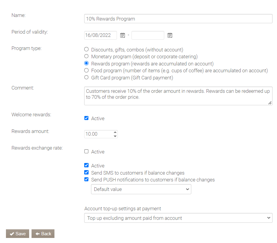 Wprowadź unikalną nazwę, wybierz Rewards program w sekcji Program type. Dodaj komentarz, jeśli jest wymagany. Wybierz Account top-up settings at payment. Zapisz program.