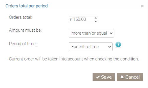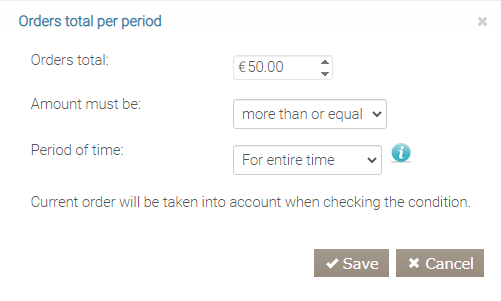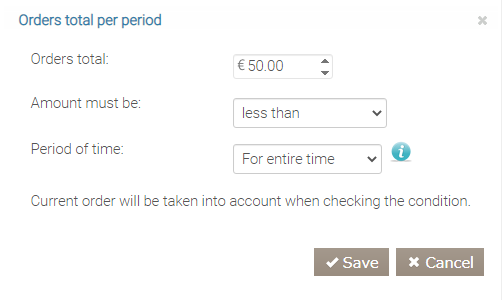 Dodaj warunek Orders Total Per Period. Ustaw warunek: „Jeśli łączna wartość zamówień klienta jest mniejsza niż 50 €.”