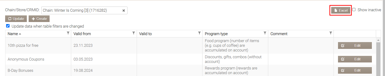 W prawym górnym rogu kliknij Excel. Plik Excel z danymi aktywnych kampanii lojalnościowych w Twoim lokalu zostanie automatycznie pobrany na Twoje urządzenie.