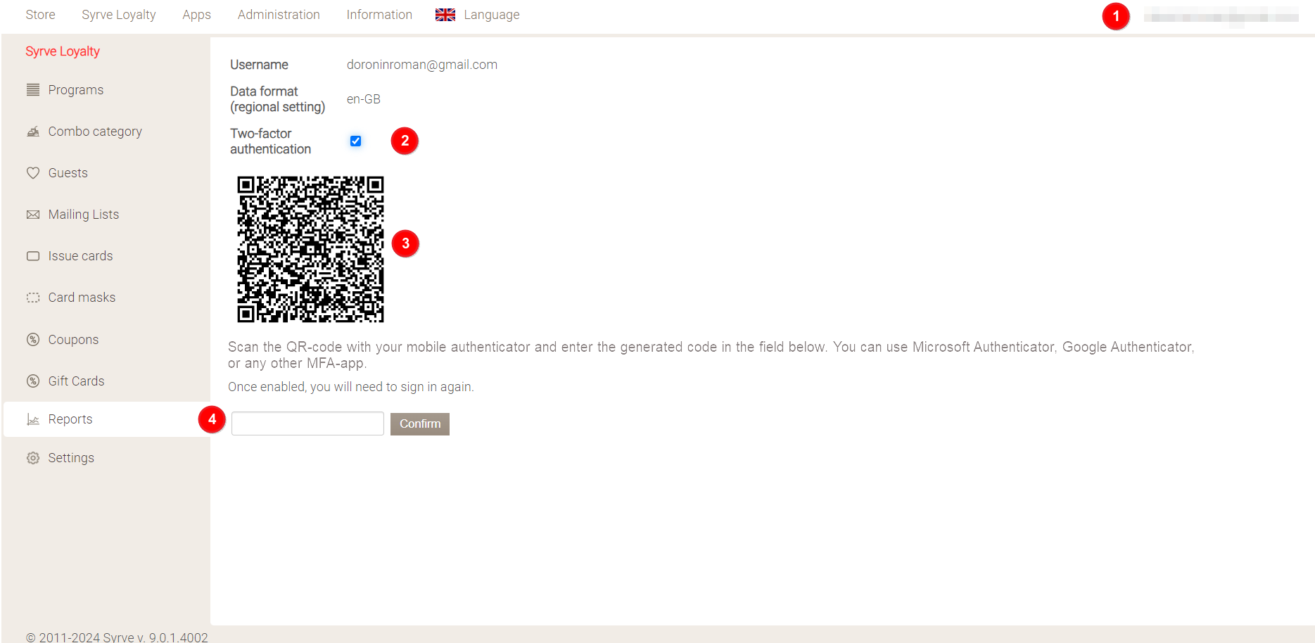 - Zaloguj się na stronie Syrve Loyalty, kliknij nazwę użytkownika w prawym górnym rogu i przejdź do ustawień konta.