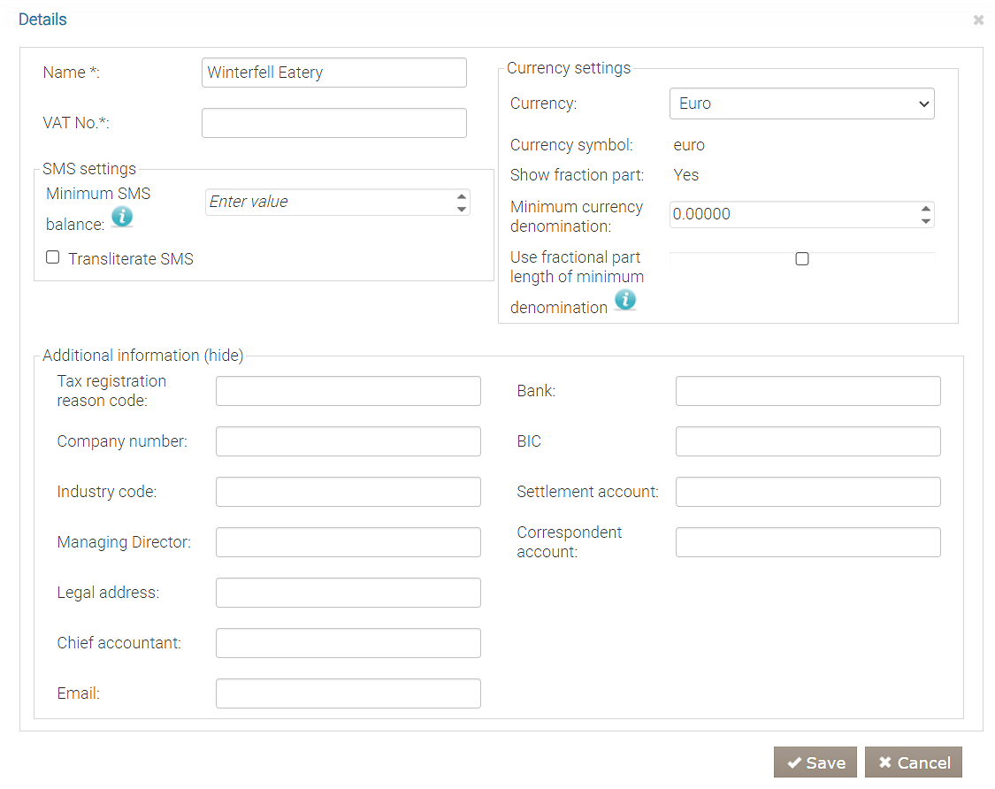 Szczegóły podmiotu prawnego można ustawić na stronie Sklepy > Podmioty prawne, wśród których znajdują się: nazwa, NIP, kod przyczyny rejestracji podatkowej, rachunek rozliczeniowy, nazwisko dyrektora itp.