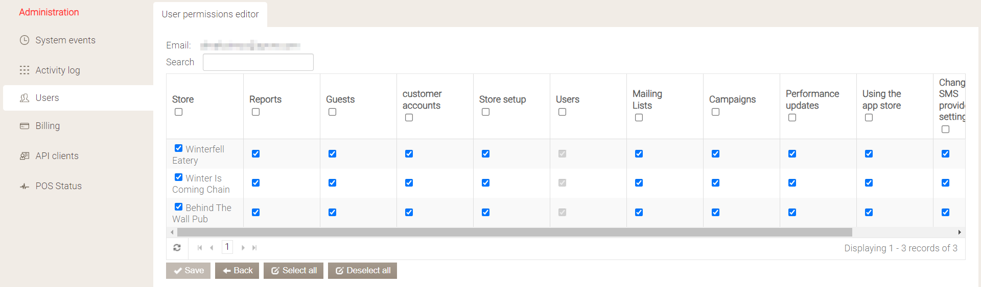 - Zaznacz uprawnienia, które chcesz przyznać użytkownikowi w linii z nazwą sklepu. W przypadku sieci restauracji nadaj uprawnienia dla każdej restauracji osobno. Na przykład użytkownik może mieć uprawnienia do przeglądania raportów w jednym punkcie sprzedaży, a do zarządzania gośćmi w innym.