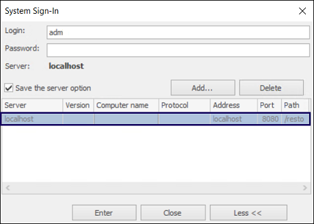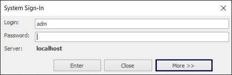 Uruchom aplikację Syrve Office i kliknij Więcej w oknie dialogowym Logowanie do systemu.