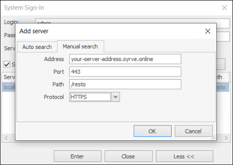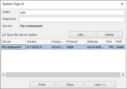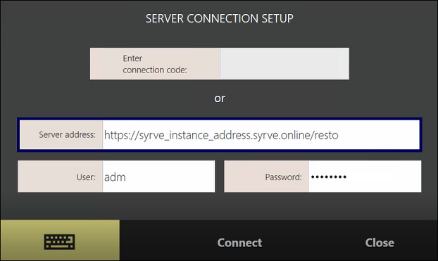 - Wprowadź adres serwera, nazwę użytkownika i hasło otrzymane od przedstawiciela Syrve.