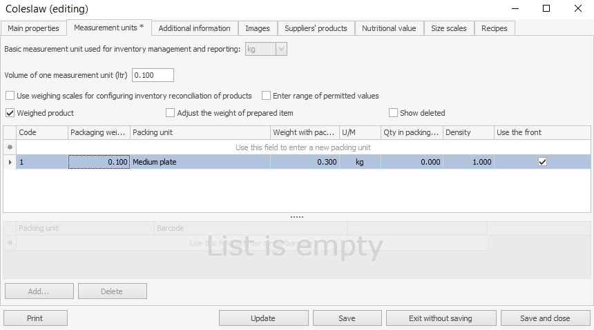 W przypadku artykułów ważonych określ pojemnik, w którym są sprzedawane. Na przykład sałatka może być sprzedawana na talerzu, a lody w miseczce. W takim przypadku, gdy zamówione są takie artykuły, Syrve POS uwzględni wagę pojemnika.