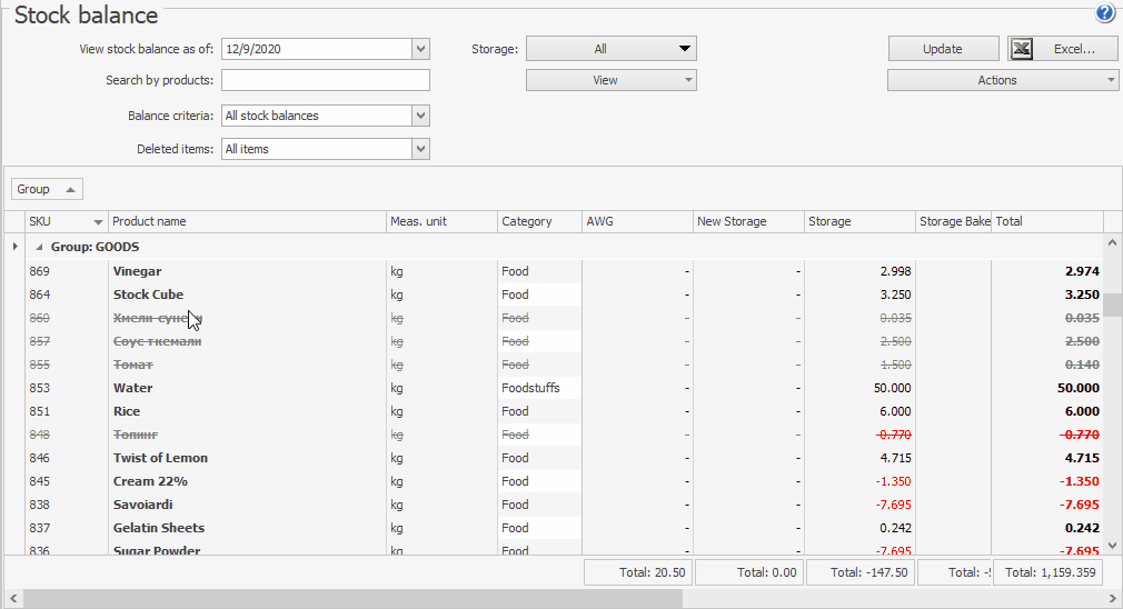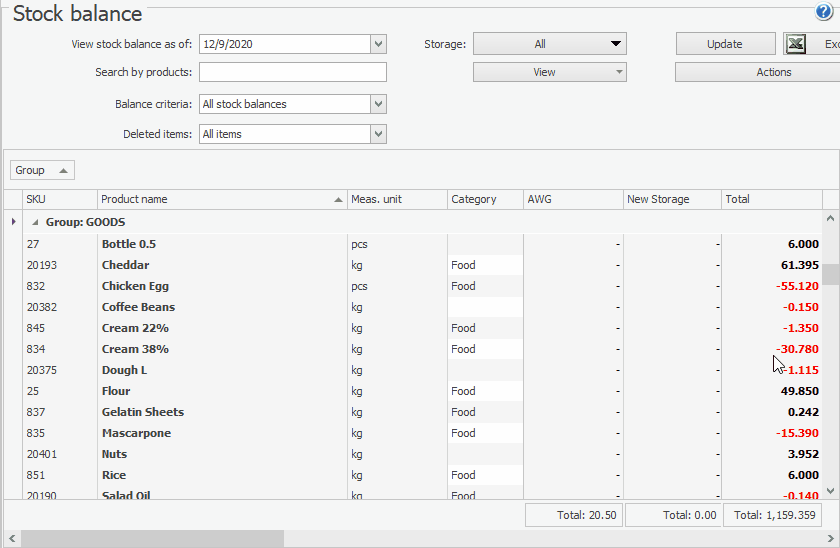 W niektórych raportach filtry znajdują się nad częścią tabeli. Aby przefiltrować dane, wystarczy wybrać wartości w polach raportu i kliknąć Aktualizuj. Raport Saldo zapasów ma następujące filtry: Kryteria salda i Usunięte pozycje.