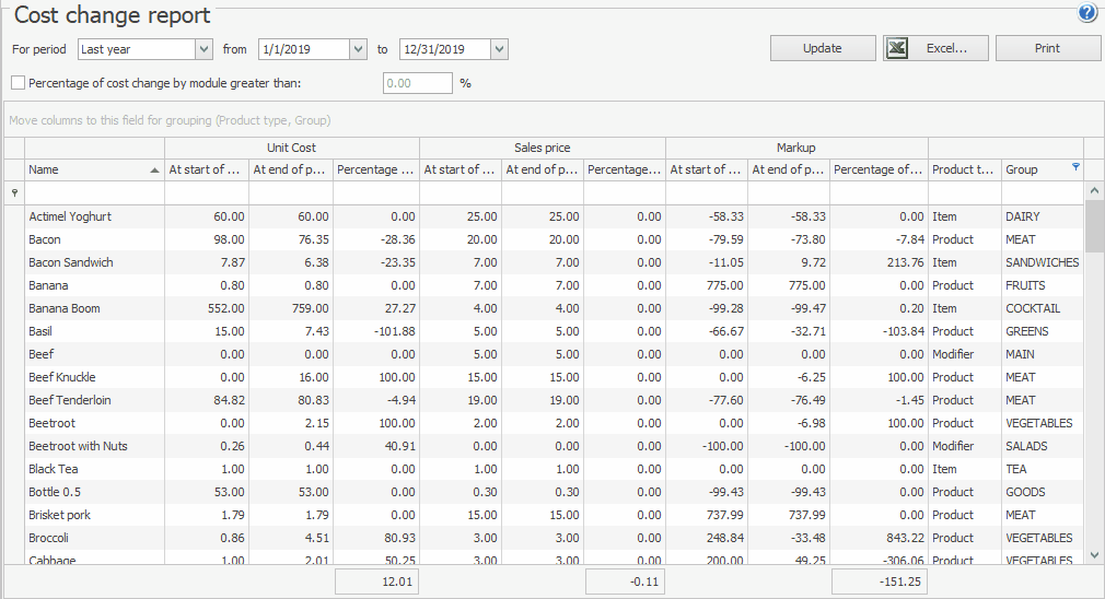 Wszystkie raporty Syrve Office działają podobnie: dane można filtrować i sortować.