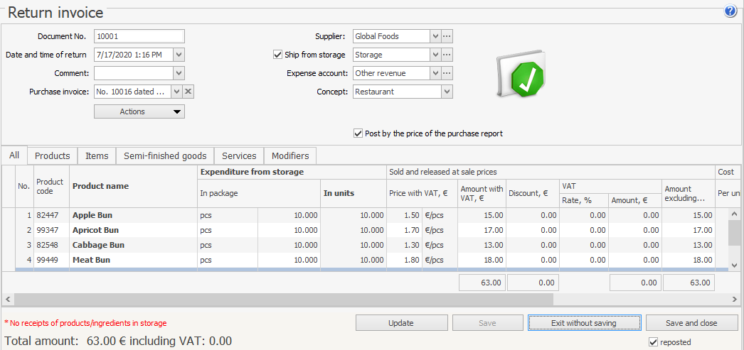 - Aby rozchodzić towary po cenie zakupu, zaznacz opcję Księguj po cenie faktury zakupu. Ponadto po zatwierdzeniu faktury zwrotnej system przeliczy koszt towarów w magazynie.
