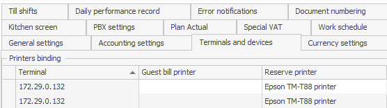 Dodatkowe powiązanie drukarek rachunków gości z terminalami jest wymagane (oprócz powiązania na poziomie sekcji), jeśli pokój jest bardzo duży, a terminale są od siebie daleko. Dla wygody można zainstalować kilka drukarek. W takim przypadku konfiguracja drukowania powinna zostać wykonana poprzez powiązanie urządzeń rezerwowych (tych, które nie zostały określone w ustawieniach sekcji) z terminalami drukarek rachunków gości.