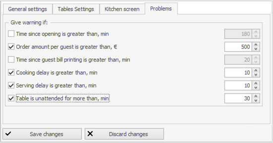 - Stół pozostawiony bez obsługi przez więcej niż, min. Kelner nie obsługiwał stołu przez długi czas. Maksymalny dozwolony czas oczekiwania jest ustawiany w minutach.