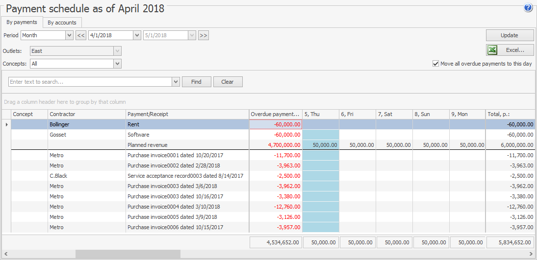 Jeśli określony okres obejmuje bieżącą datę, wszystkie przeterminowane płatności zostaną pokazane na dzień bieżący w osobnej kolumnie. W tym celu musisz zaznaczyć opcję Przenieś wszystkie przeterminowane płatności na ten dzień.
