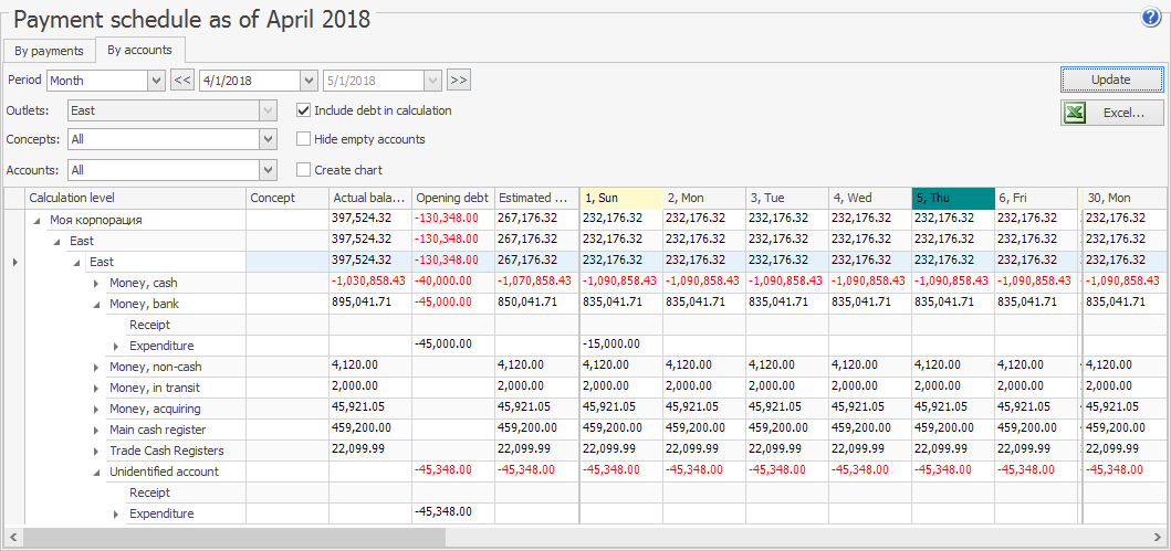Każde konto pokazuje swoje dzienne saldo i przepływy gotówki: