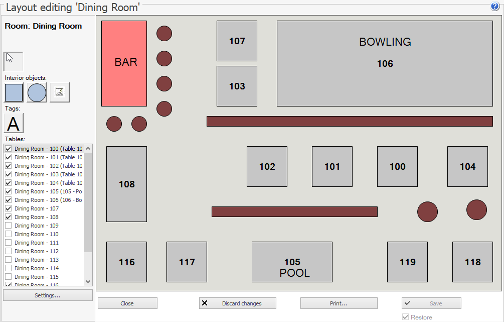Plan sali może już zawierać ułożone stoliki, których liczba jest określona przez ustawienia sekcji. Ułóż na planie elementy wnętrza, na przykład tor do kręgli, i rozmieszczaj stoliki, zwracając uwagę na ich numery.