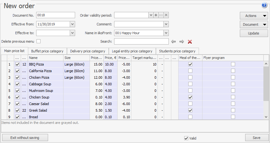 Jeśli opcja Usuń poprzedni element menu jest zaznaczona, nowy cennik będzie zawierał tylko pozycje z nowej aktualizacji. Ten parametr nie jest dostępny dla aktualizacji czasowych.